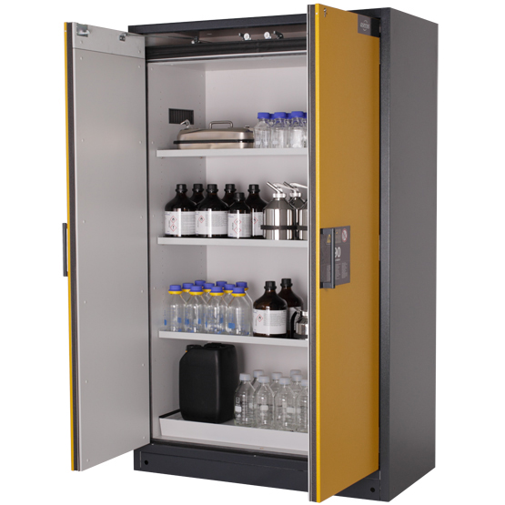 Es un armario extremadamente robusto y un lacado grofado resistente a los arañazos. Además cuanta con una gran resistencia a la torción, lo cual simplifica su centrado y permite colocarlo sin problemas junto a otros armarios. La amortiguación ajustable de este armario de seguridad ofrece mucho más comodidad a la hora de introducir y retirar sustancias peligrosas, gracias a esta novedad técnica las puertas pueden permanecer abiertas en cualquier ángulo de abertura, con lo cuyal no es necesario el uso de un dispositivo de bloqueo de puertas. Posee un zócalo integrado fijo y accesible para transpaleta.